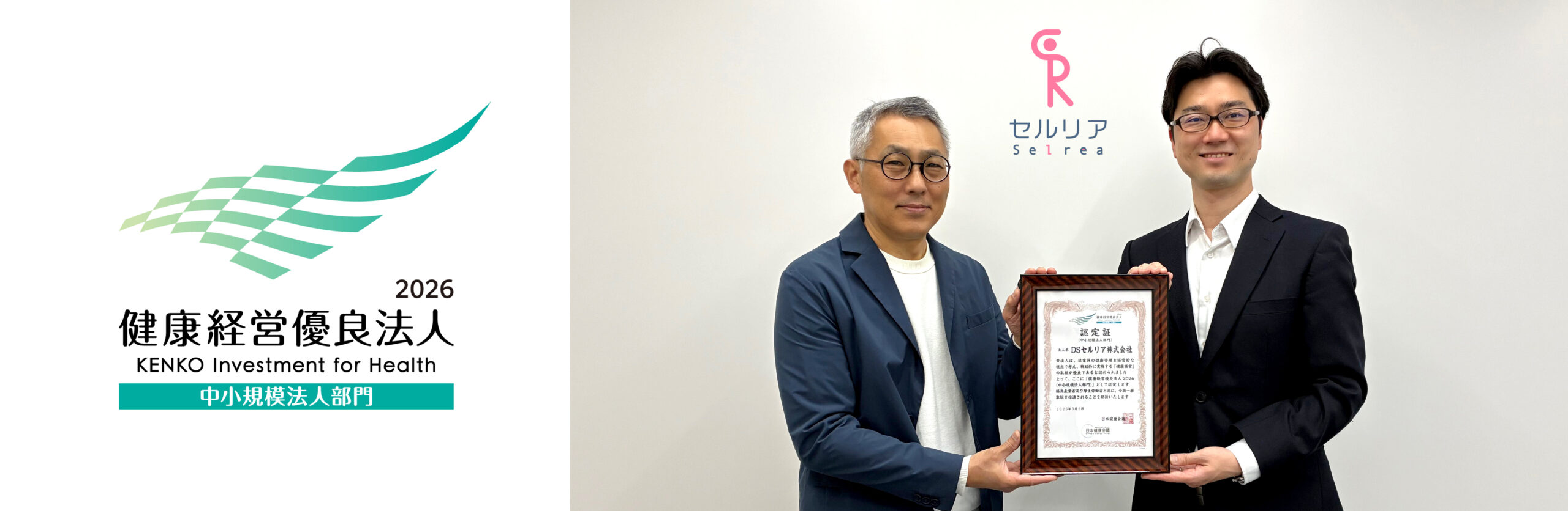 DSヘルスケアグループ(代表・CEO:寒竹 郁夫)のDSセルリア株式会社(本社:千葉県千葉市、代表取締役:北村直也)は、経済産業省および日本健康会議が選定する「健康経営優良法人2026(中小規模法人部門)」に認定されましたことをお知らせします。